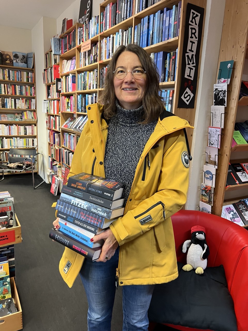 Im Buchladen habe ich den großen Stapel bestellte Bücher abgeholt. Alles Psychothriller, weil ich mich mit dem Genre näher beschäftigen will. Denn so sehr ich versucht hatte, die Geschichte von Heather als Krimi zu erzählen, so sehr wollte sie ein Psychothriller werden. Erst als ich nachgegeben habe, konnte ich das Manuskript fertig schreiben. Fürs Überarbeiten brauche ich aber noch ein bisschen mehr Genre-Kenntnis.