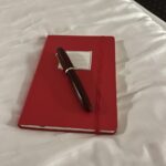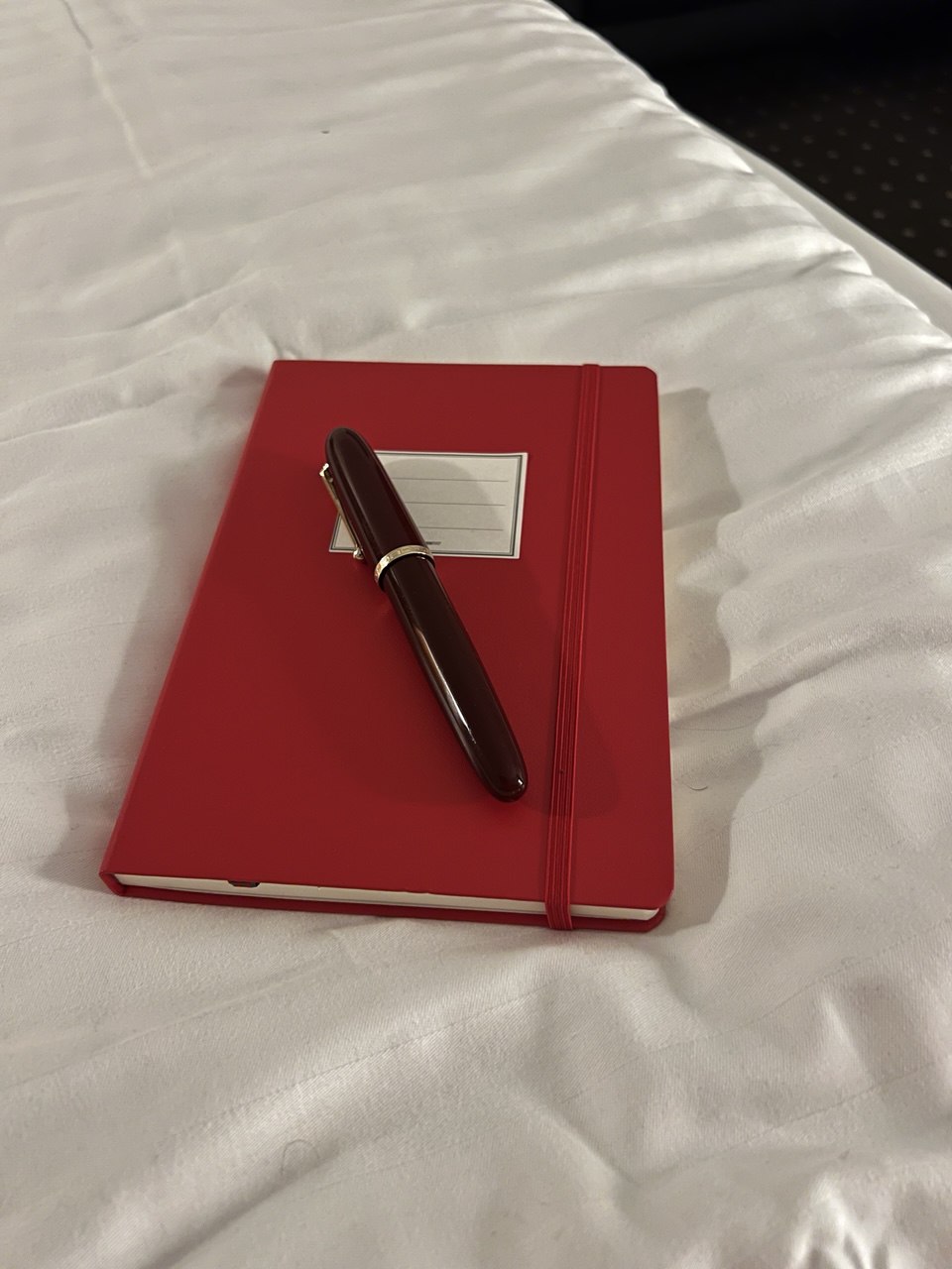 Kurz vorm schlafen liege ich mit einem neuen Notizbuch in einem Hotelbett.