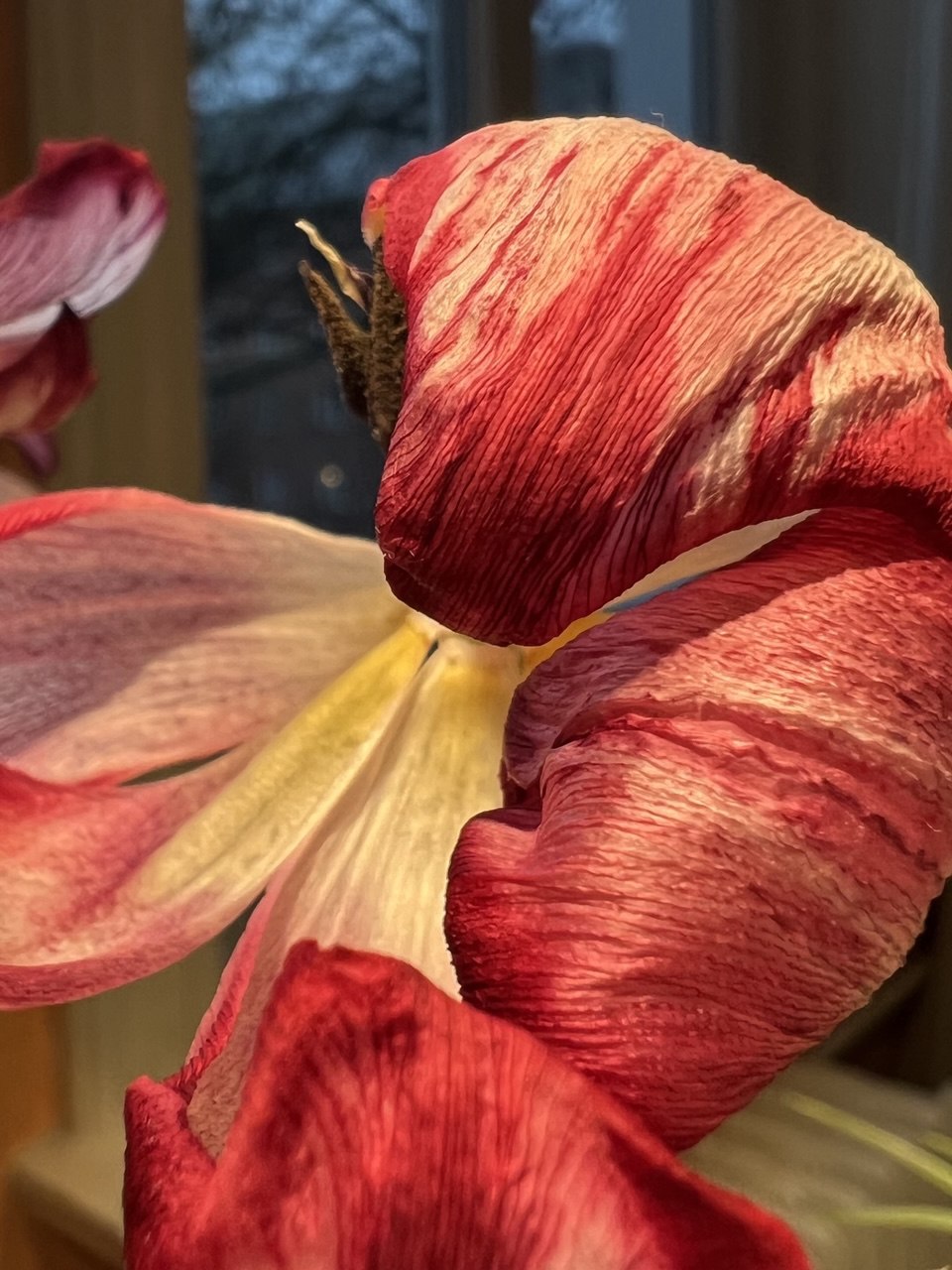 Die Schreibtischtulpen welken. Ich mag, wie die Blüten sich verändern und finde, sie haben Schönheit in jedem Stadium.